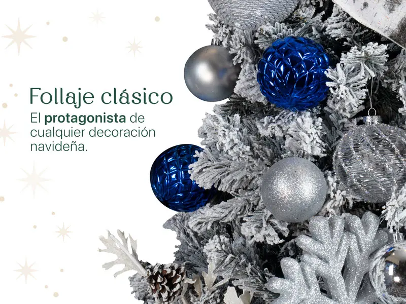 El Árbol de Navidad Frondoso con ramas escarchadas aporta tradición y elegancia con su follaje cubierto de nieve artificial y estilo nórdico invernal. Sus ramas frondosas son el lienzo perfecto para adornar con luces y esferas.
