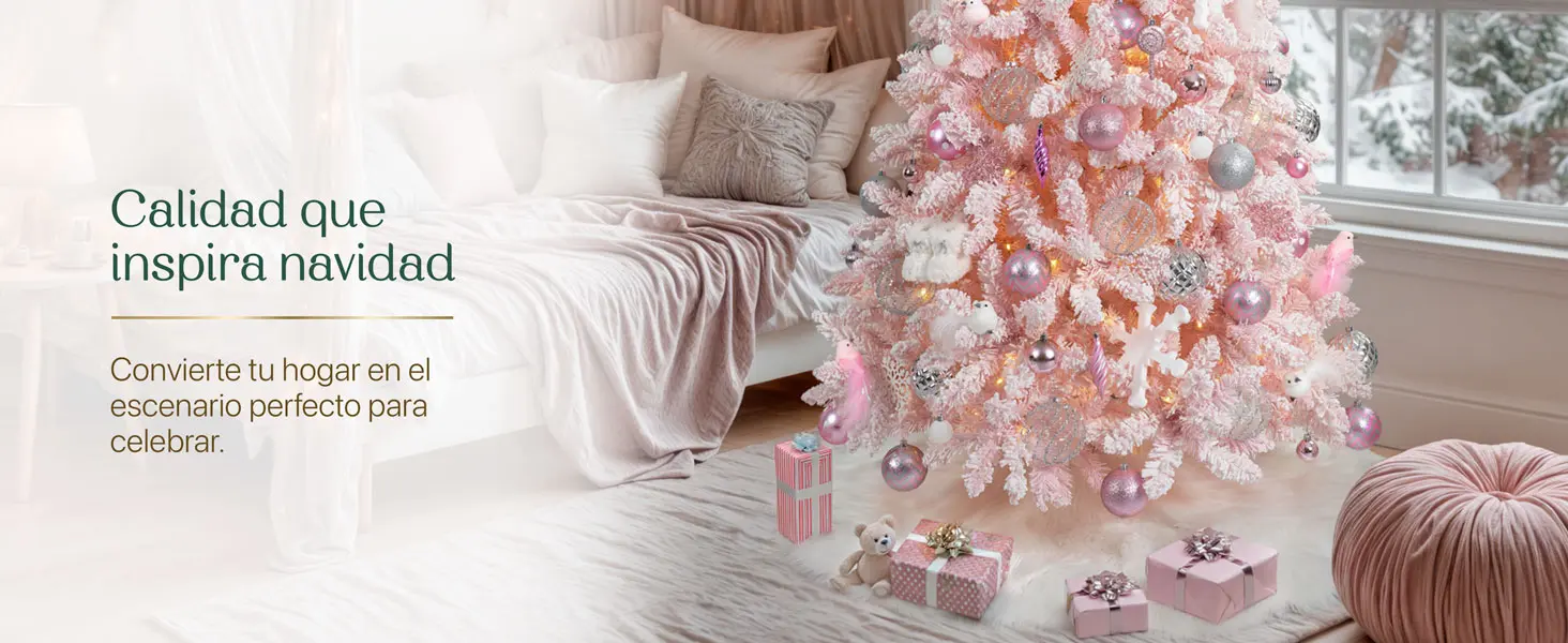 El diseño clásico en forma cónica y el concepto nórdico invernal se fusionan con el acabado en rosa nevado, ofreciendo un estilo único que equilibra tradición y modernidad en la decoración navideña.