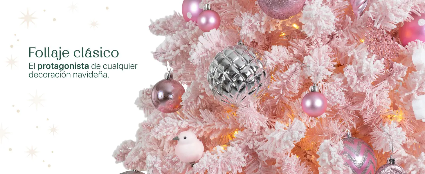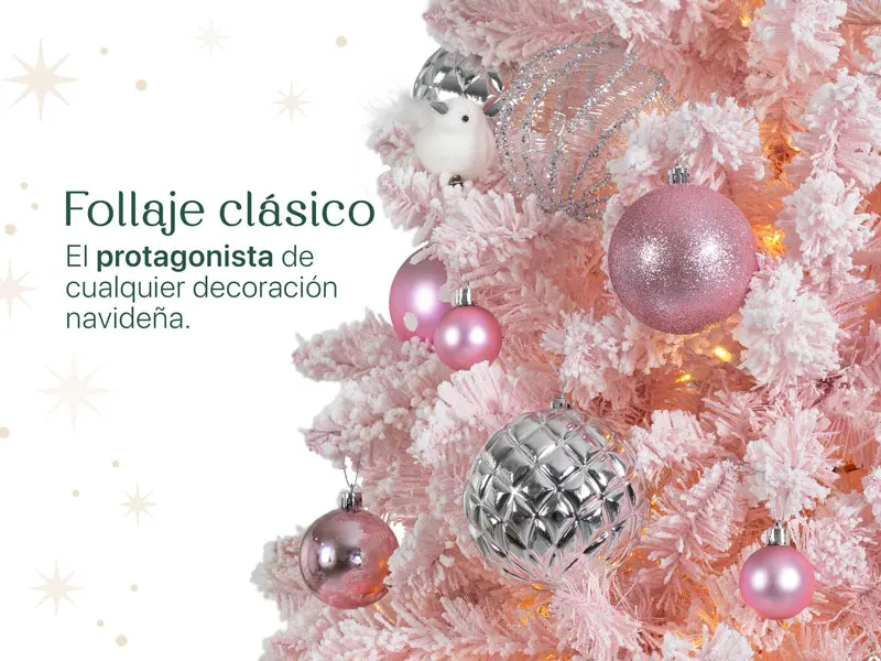 El follaje nevado uniforme en color rosa está elaborado en 100% PVC, ligero y resistente, con ramas firmes que facilitan la colocación de adornos y luces. Su diseño transmite una apariencia natural y sofisticada.