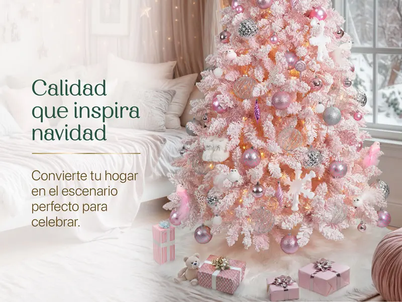 Su acabado nevado en tono rosa, acompañado de una estrella plateada metálica de cinco puntas, lo convierte en una pieza única que combina tradición y modernidad. Con sistema de armado automático y materiales resistentes, este árbol está diseñado para decorar tu hogar con estilo y durabilidad.