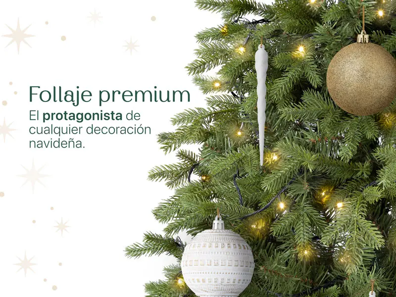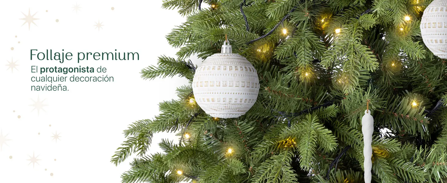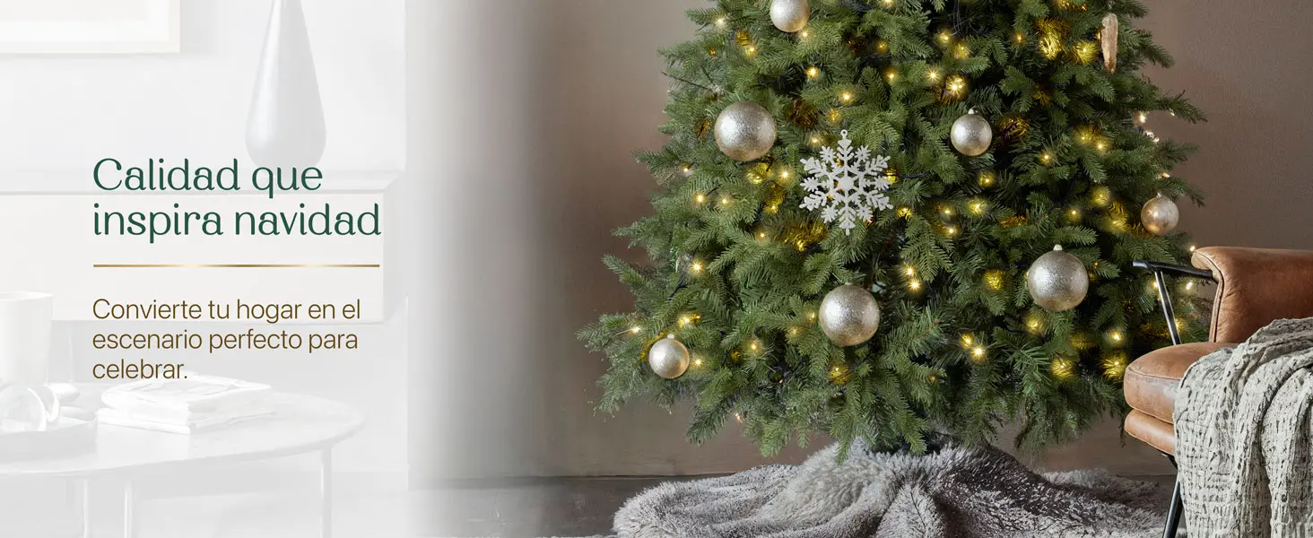 El árbol cuenta con un follaje frondoso de estilo clásico combina densidad visual, silueta cónica equilibrada y un color verde atemporal para lograr que luzca lleno, elegante y fácil de decorar.