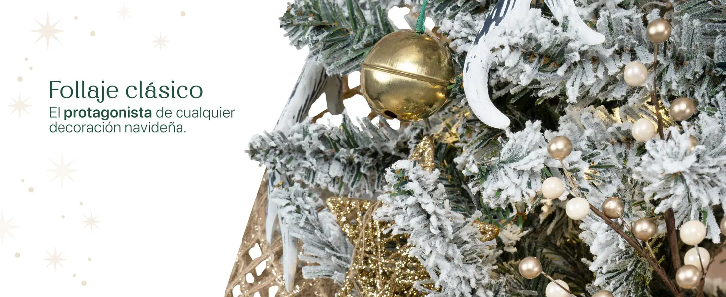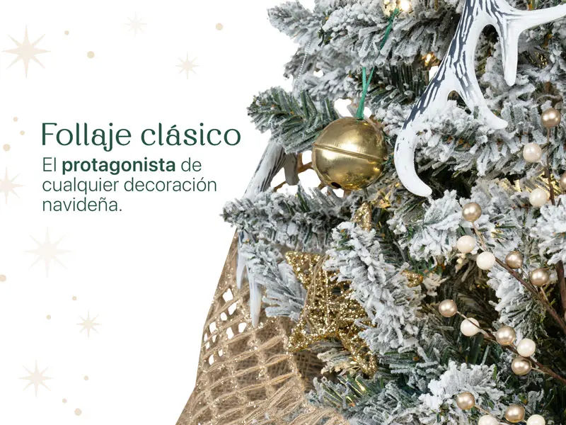 El follaje nevado es abundante y uniforme, elaborado en 100% PVC de alta calidad que ofrece resistencia, ligereza y una apariencia inspirada en paisajes invernales. Sus ramas firmes permiten decorar fácilmente con esferas, guirnaldas y luces.