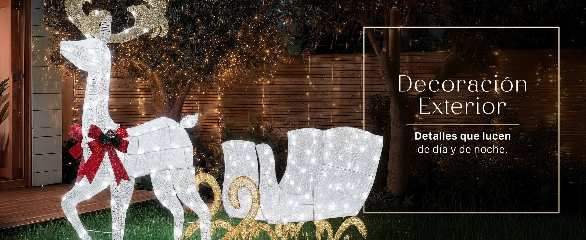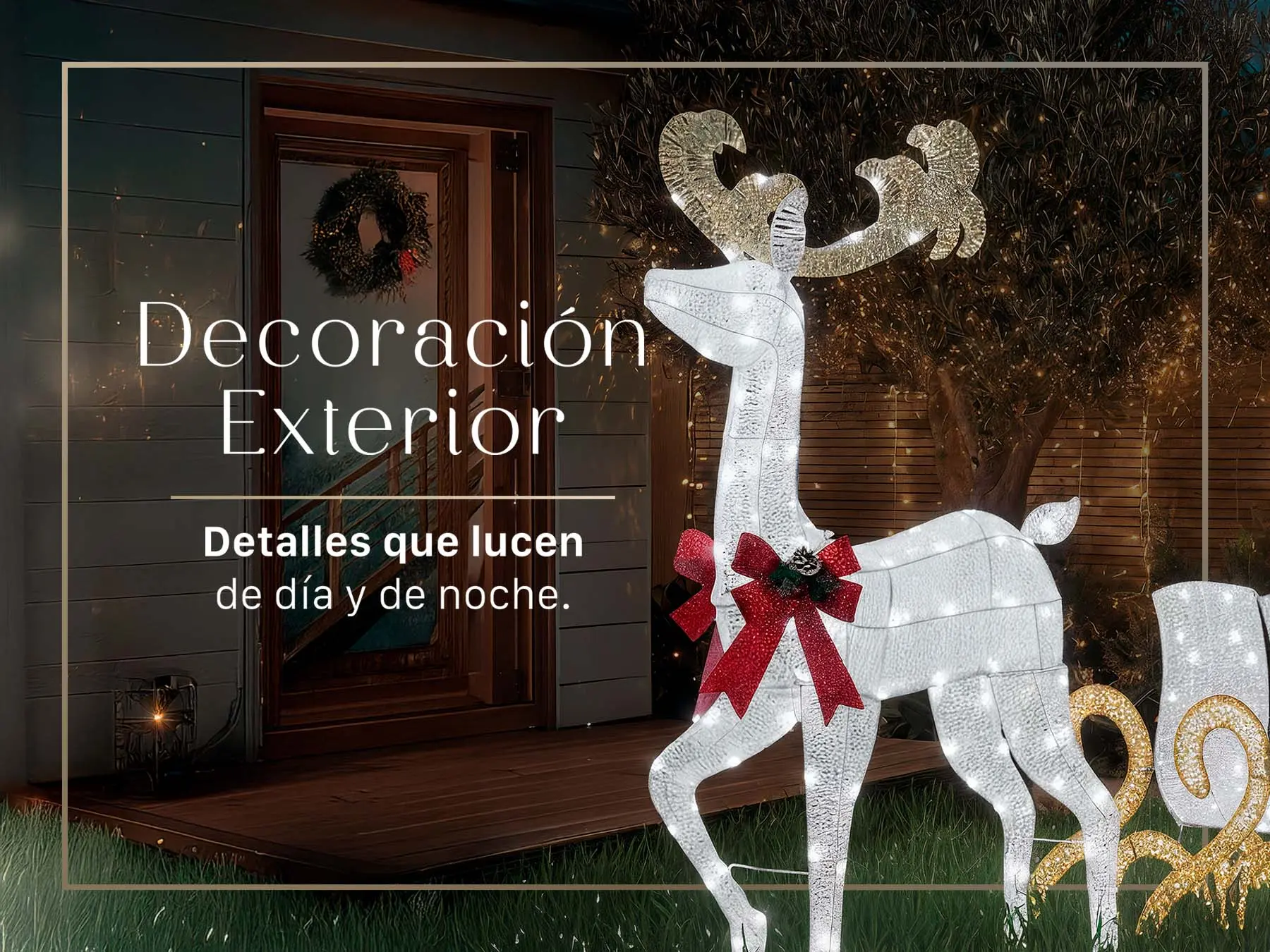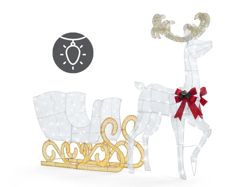 Haz de tu entrada, fachada o jardín un sueño navideño con el Reno con Trineo Iluminado. Su iluminación LED de bajo consumo crea una escena luminosa y acogedora que invita a celebrar, mientras su acabado en hilo de algodón aporta un toque artesanal que luce tanto de día como de noche.