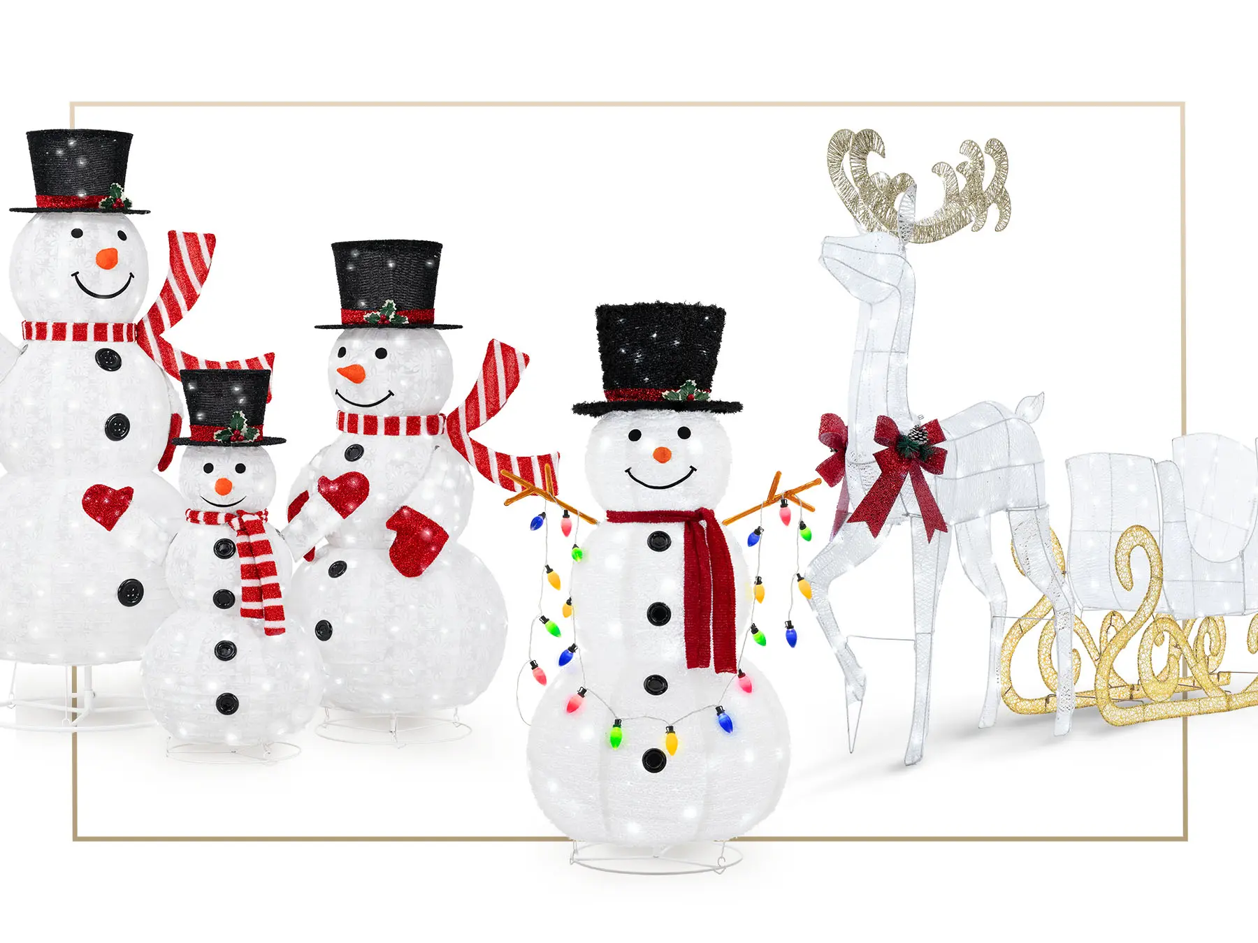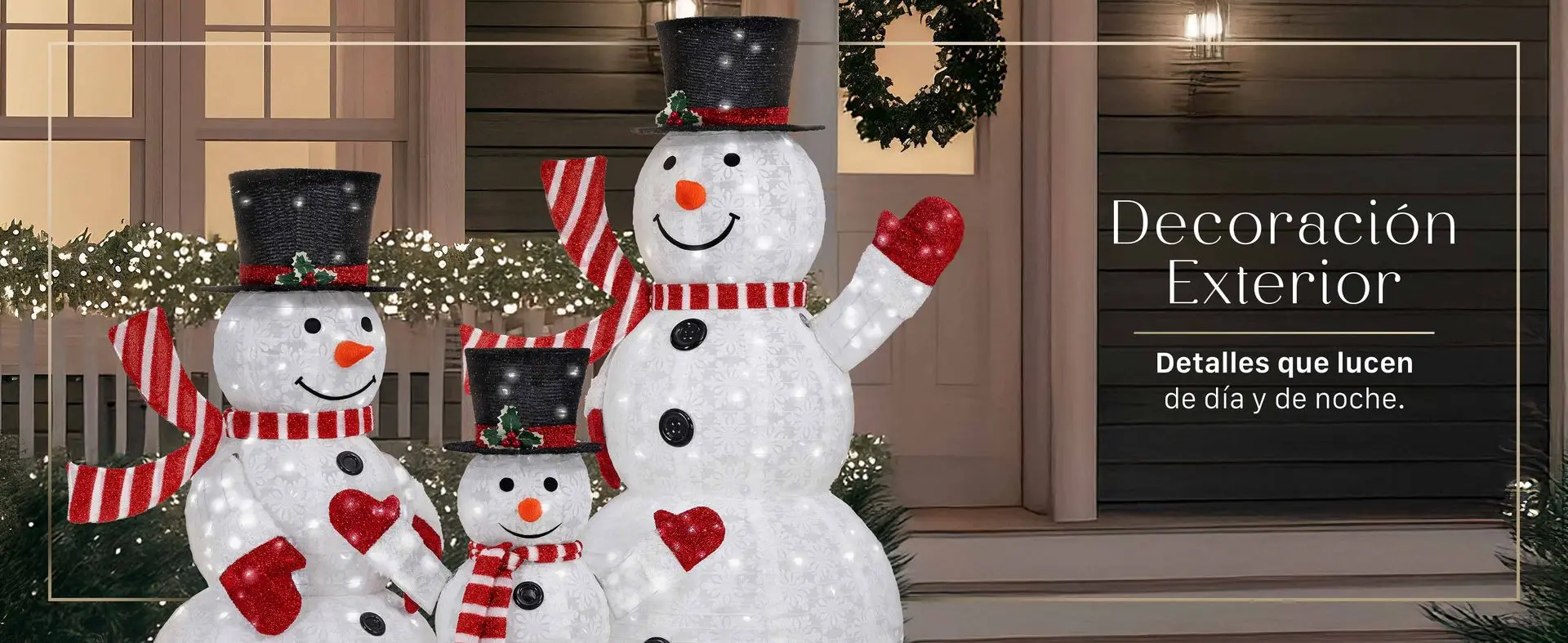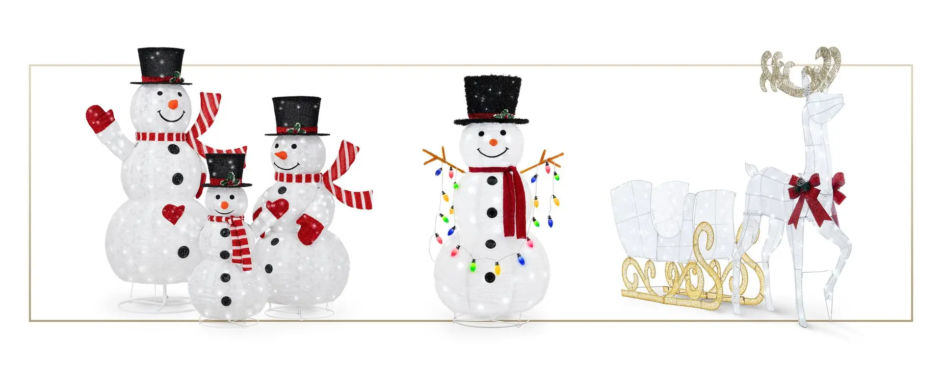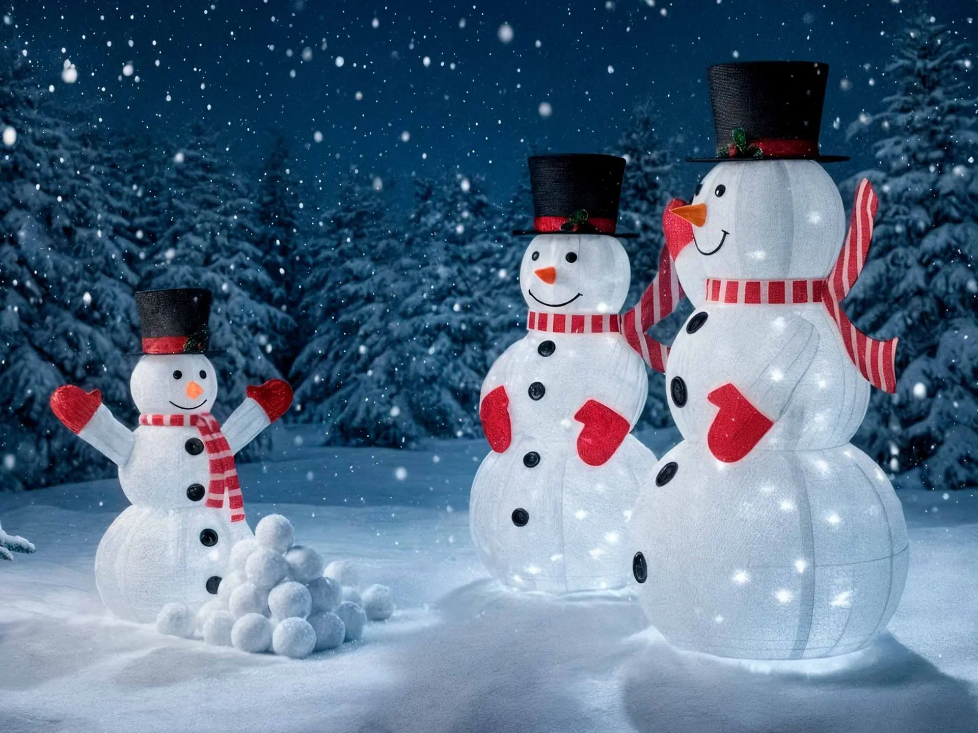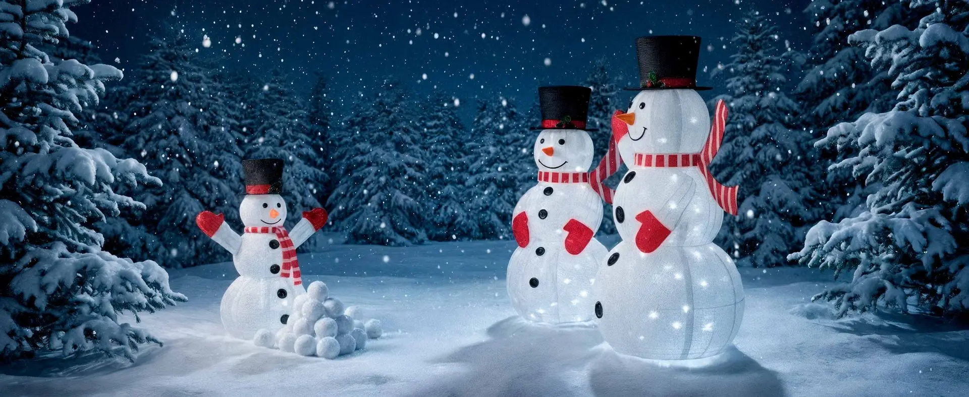 Convierte tu entrada, fachada o jardín en un sueño navideño con la Familia de Muñecos de Nieve Decorativos.