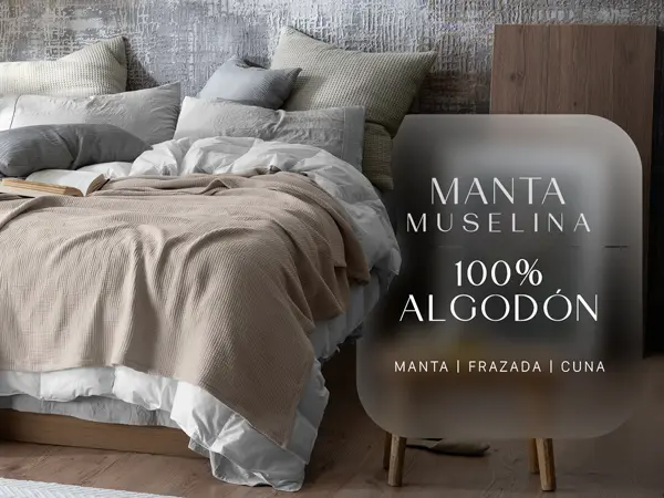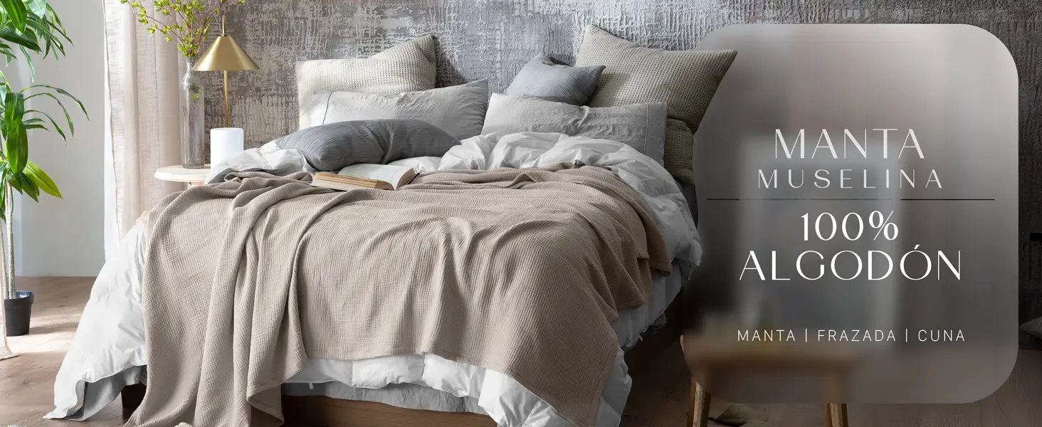 Envuelve tus momentos de descanso en una sensación de frescura y suavidad natural. La Colcha/Manta de Muselina 100% algodón está diseñada para ofrecerte comodidad diaria, con un tacto amable que invita a relajarte en la cama, creando espacios de bienestar y calma en tu hogar.